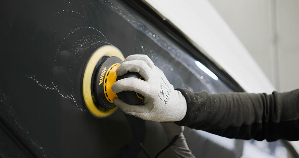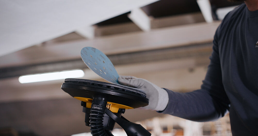 Start sanding with Mirka DEROS II 650CV using a Net Interface and Galaxy 1200 or 1500 grit.