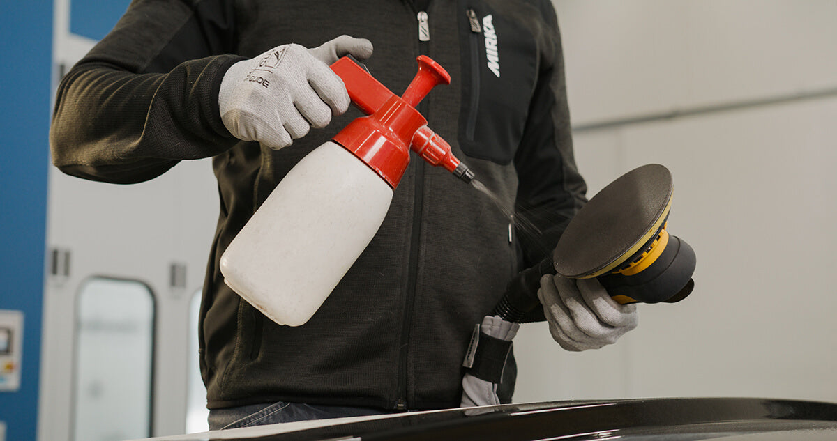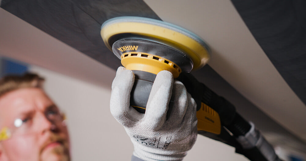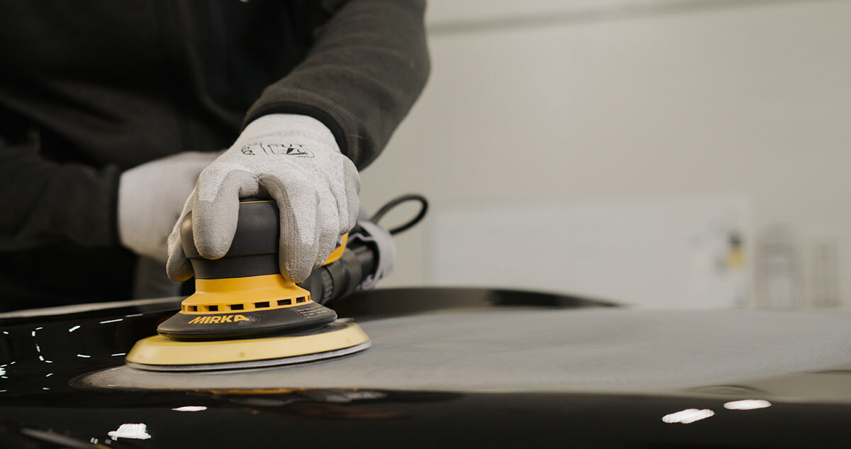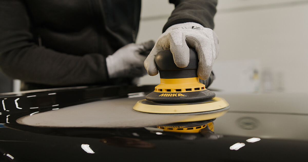 For orange peel surfaces, start sanding with Mirka Galaxy 600 grit together with Mirka Deros II Sander.