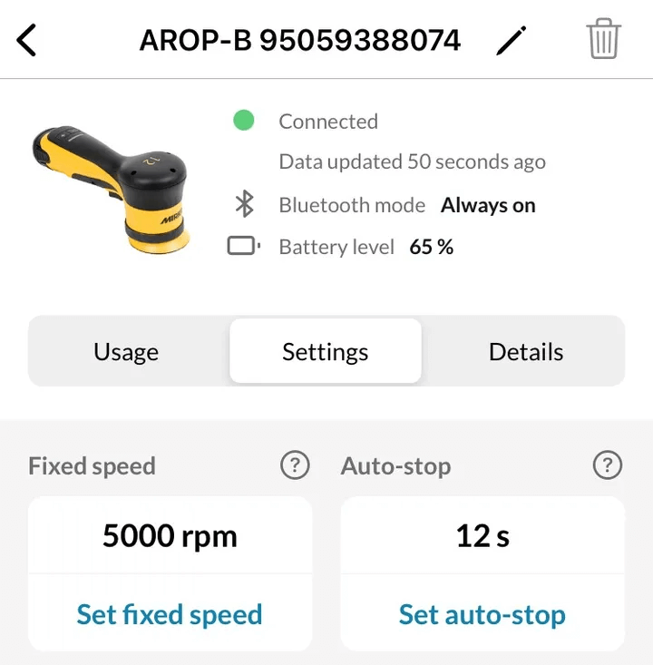 Connect your Bluetooth enabled Mirka tool with myMirka app to see information about the tool. With the myMirka app, you can measure vibrations and track your daily vibration exposure. You can also view the tool's battery level and health.